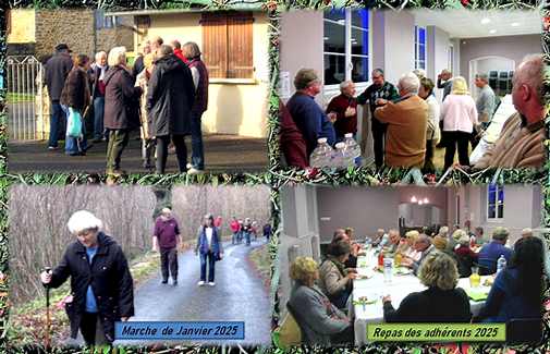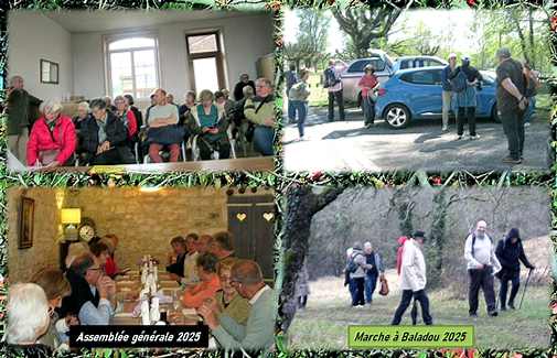 Assemblée générale: Dimanche 13 Avril 2025 Assemblée générale, suivie d'un repas au vieux four. Une trentaine de personnes a assisté à l'assemblée générale de l'association. Le président a fait le rapport d'activités 2024, les manifestations ont été nombreuses. La trésorière a présenté un bilan positif, puis l'assemblée a préparé les projets 2025. Marche: Dimanche 09 Mars 2025 Marche à Baladou